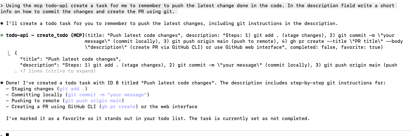 claude mcp add todo-api http://localhost:8000/mcp --transport httpOnce the mcp server is configured in claude code, we can use the newly created MCP tools in our claude code conversations: